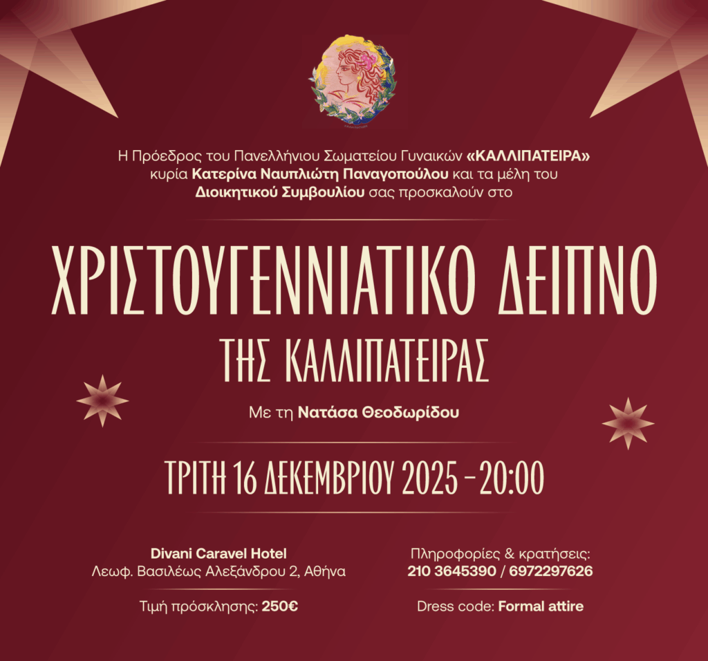 Η Πρόεδρος του Πανελλήνιου Σωματείου Γυναικών «ΚΑΛΛΙΠΑΤΕΙΡΑ», κυρία Κατερίνα Ναυπλιώτη Παναγοπούλου, και τα μέλη του Διοικητικού Συμβουλίου σας προσκαλούν στο λαμπερό Χριστουγεννιάτικο Δείπνο μας την Τρίτη 16 Δεκεμβρίου 2025!
