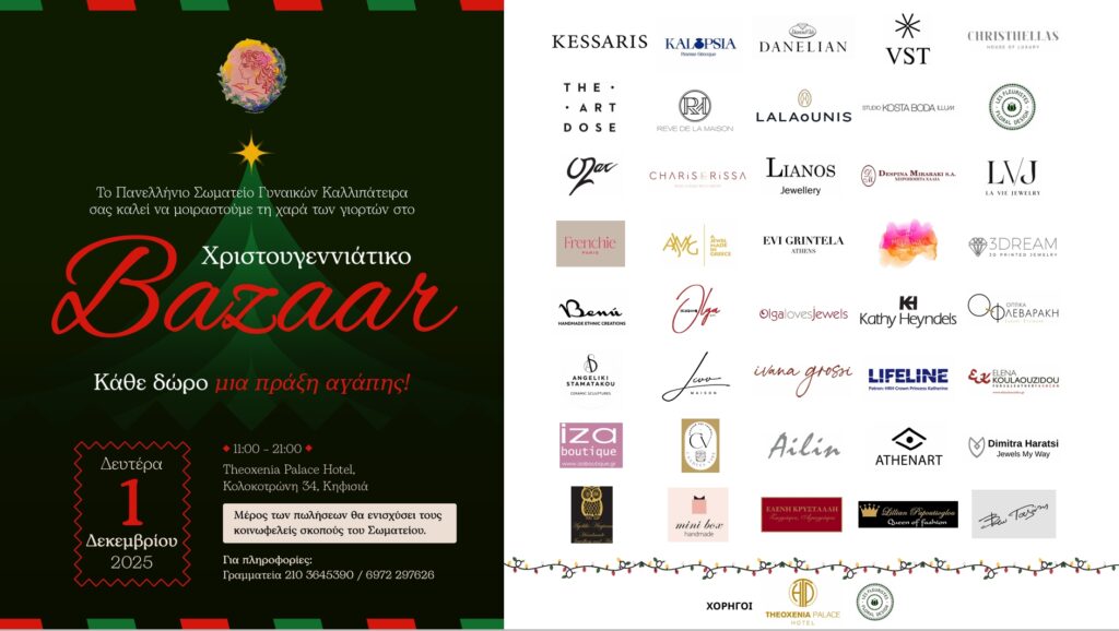 Τα Χριστούγεννα πλησιάζουν και η ΚΑΛΛΙΠΑΤΕΙΡΑ σας προσκαλεί στο Χριστουγεννιάτικο Φιλανθρωπικό Bazaar, τη Δευτέρα 1 Δεκεμβρίου, από τις 11:00 έως τις 21:00, στο Theoxenia Palace Hotel (Κολοκοτρώνη 34, Κηφισιά).